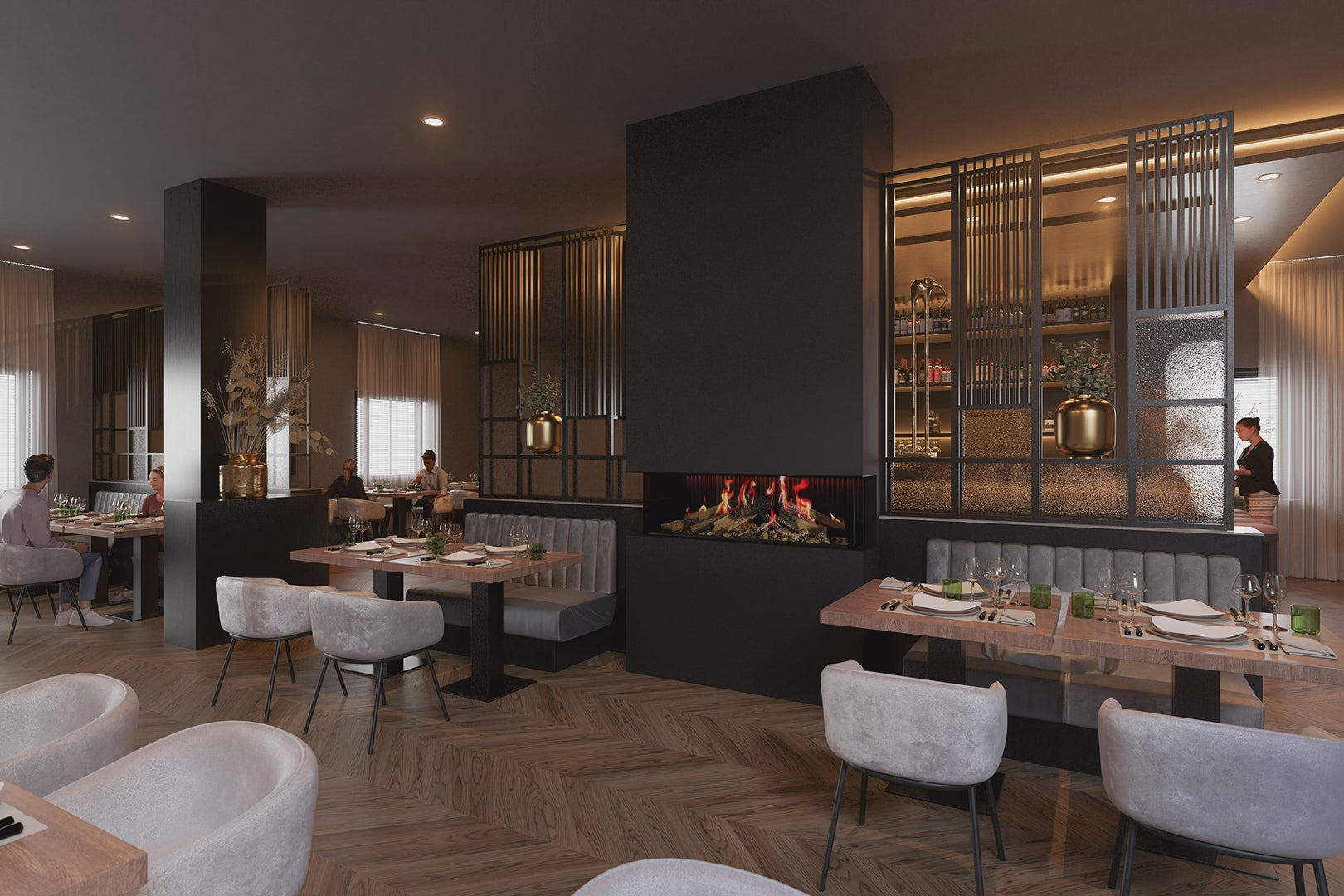 Deze haard is perfect voor inbouw in een cinewall, tussenwand of nis waar je vanuit meerdere hoeken van het vuur wilt genieten. De ontspiegelde glaspartijen aan de voor- en zijkant zorgen voor een panoramisch uitzicht op het haardvuur – overdag én ’s avonds even indrukwekkend.