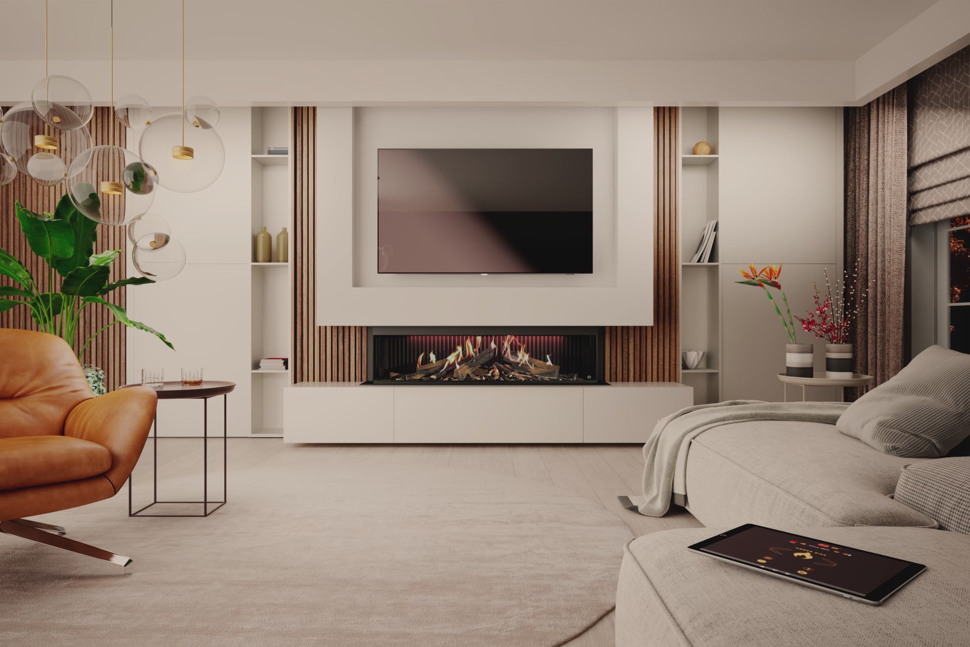 Deze haard is perfect voor inbouw in een cinewall, roomdivider of luxe wandmeubel waar je het vuur vanuit meerdere hoeken wilt beleven. Het ontspiegelde glas zorgt voor een helder zicht, zonder reflecties – overdag én ’s avonds. Dankzij de slimme bediening en instelbare sfeeropties creëer je altijd de juiste ambiance.